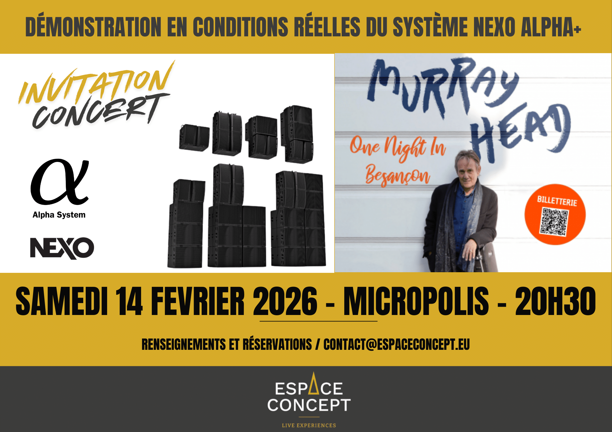 À l’occasion du concert de Murray Head, le samedi 14 février 2026 à 20h30 à Micropolis – Besançon (25), Espace Concept aura le plaisir de présenter son tout nouveau système de diffusion NEXO ALPHA+.